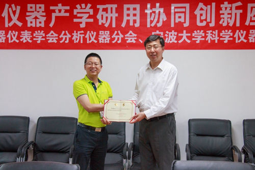 中國儀器儀表學會分析儀器分會理事長關亞風、常務副理事長劉長寬代表分會向寧波華儀寧創智能科技有限公司總經理聞路紅授牌。